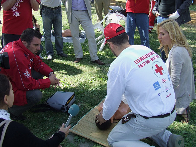A programban részt vevő önkéntesek, akik a legtipikusabb strandsérülések - ájulás, sportbaleset, horzsolás, kagyló okozta vágás - ellátásából bemutatót tartottak a balatonlellei strandon, augusztus 22-ig, minden nap 10 és 18 óra között adnak szolgálatot. A fiatalok megmutatták azt is, mennyire jártasak az újraélesztés fogásaiban.
